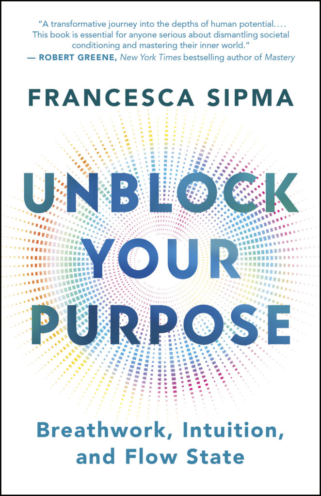 Her Instagram account (@francescasipma) shows her in chic, sunny poolside settings and on French mountaintops leading sessions with participants lying face up on yoga mats, blindfolds covering their eyes. But despite the polished publicity, Sipma isn’t interested in gatekeeping her method. She’s making it available to everyone in her new book, Unblock Your Purpose: Breathwork, Intuition, and Flow State, and in her app, Mastry. She’s passionate about the practice’s advantages for everyone but thinks there is an especially good fit for entrepreneurs, executives and highly driven individuals.